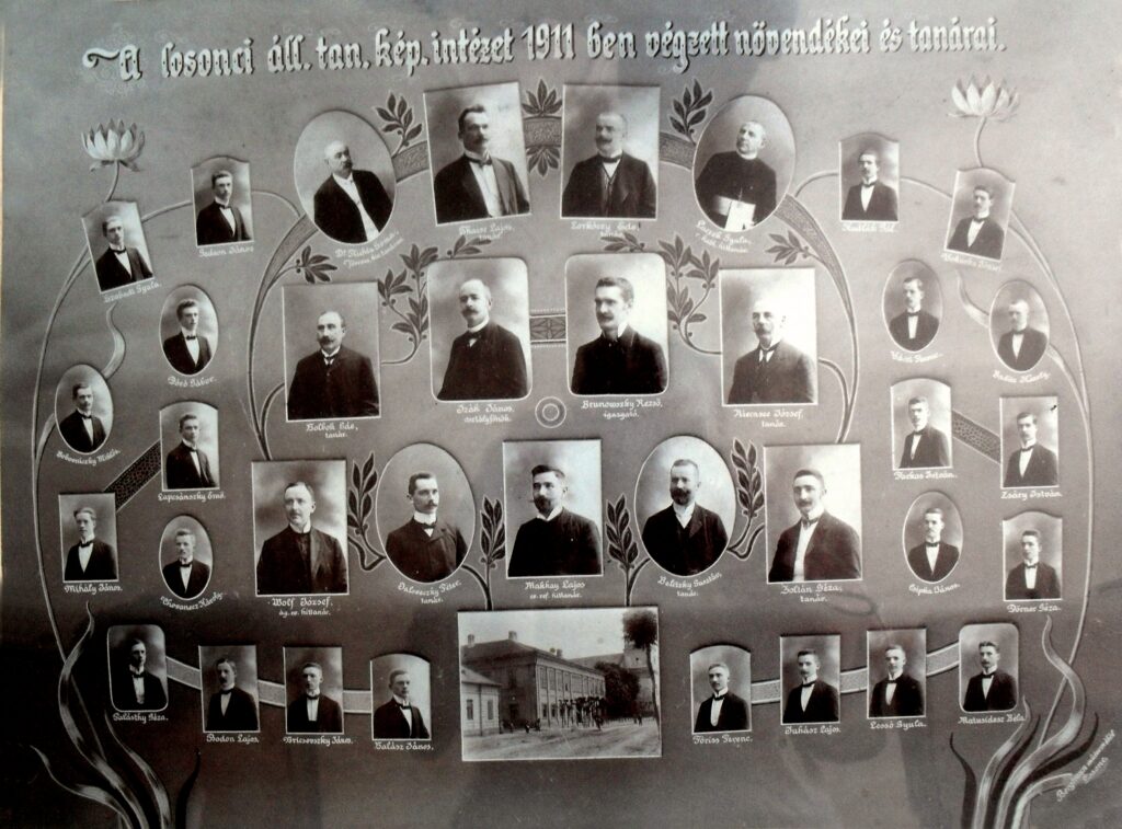 A losonci általános tanítóképző intézet 1911-ben végzett növendékei és tanárai. A fényképen Nemesradnótról Bodon Lajos található.