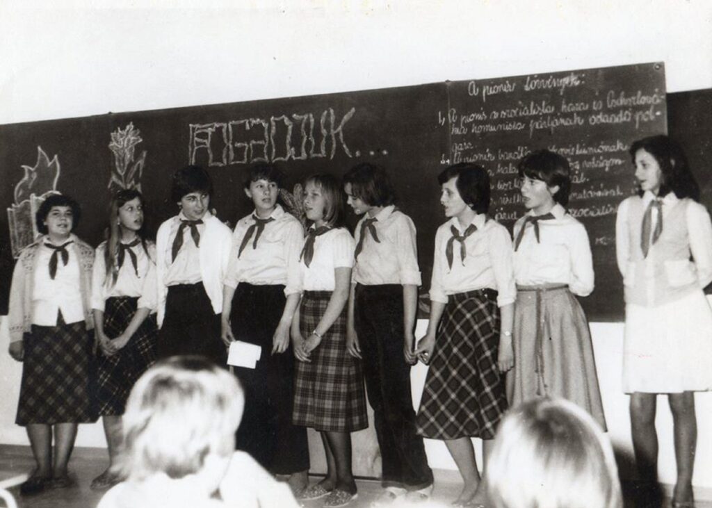 Az iskolai táblán a pionír törvények, előtte meg az akkori pionírok.