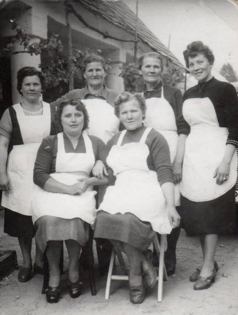 A régi időkben a lakodalmakat „házaknál” tartották. A fotós az ilyen lagzin örökítette meg a felszolgáló hölgyeket.