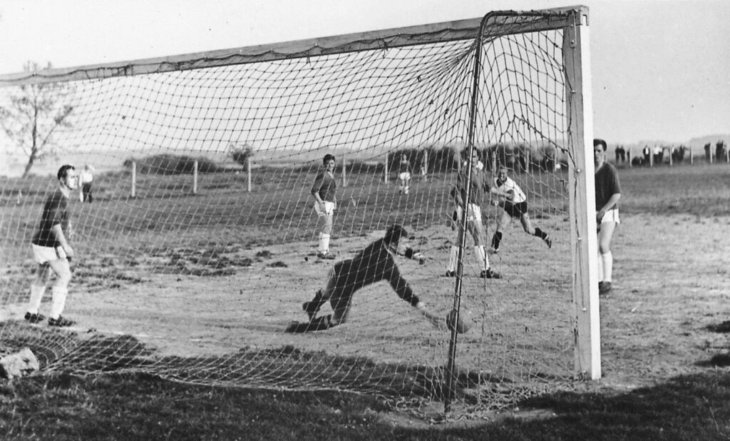 A régi Vág-parti focipályán, ahol az 1960-as években is az volt a szokás, hogy aprópénzt dobtak a kapuba, mert úgy tartották, szerencsét hoz, megvéd a góltól.
