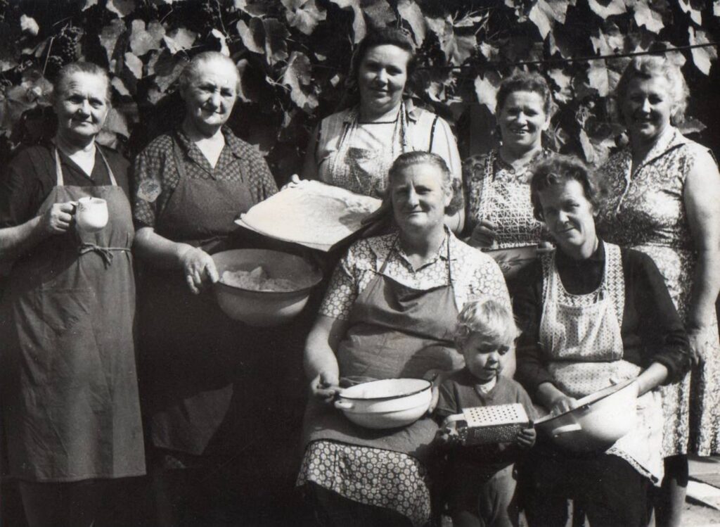 A szakácsnők egy csoportja, mikor még házaknál tartották a lakodalmakat.