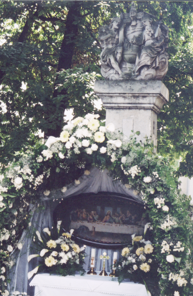 A Szentháromság-szobor előtt felállított úrnapi sátor