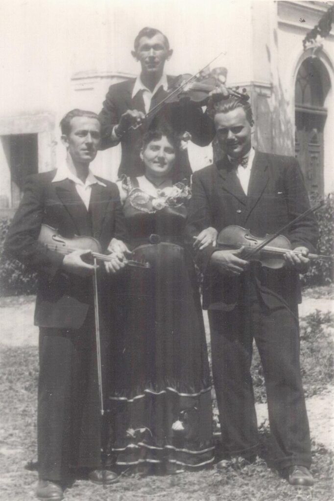 A nemesradnóti színjátszó csoport tagjai: Gál Piroska, Pósa Dezső, Bettes István, Bodon Gyula. A fénykép az „Én vagyok a falu rossza egyedül” című színdarab bemutatása előtt készült Nemesradnóton a templom előtt.