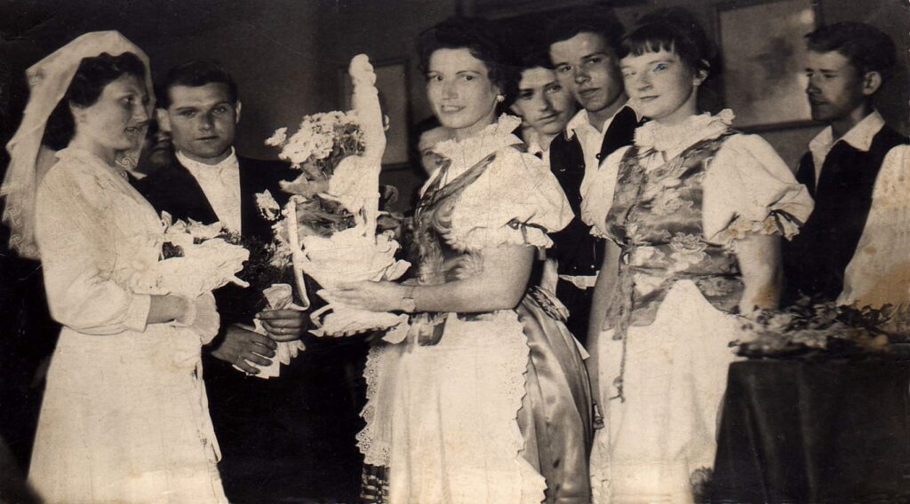 Terpák László és Neizer Erzsébet esküvőjén gratulálnak a népviseletbe öltözött táncosok Békési Pötyi, Dienes Béla, Iván János,… Iván Dezső.