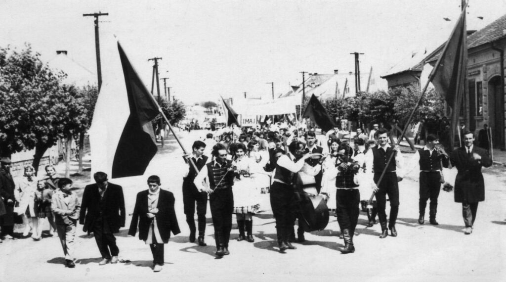 Tornalja egykori Fő utcáján, ma Béke utca, népviseletbe öltözött tánccsoport tagjai. 60-as évek eleje. A fotó Iván Dezső emlékalbumából van. Háttérben a mai Rákóczi Magyar Ház. Ebben az időben három néptánccsoport is működött a városban. A tánccsoport tagjai a zenekarral megérkeznek a mai Dobsinsky utcához, akkor Berekk utca.