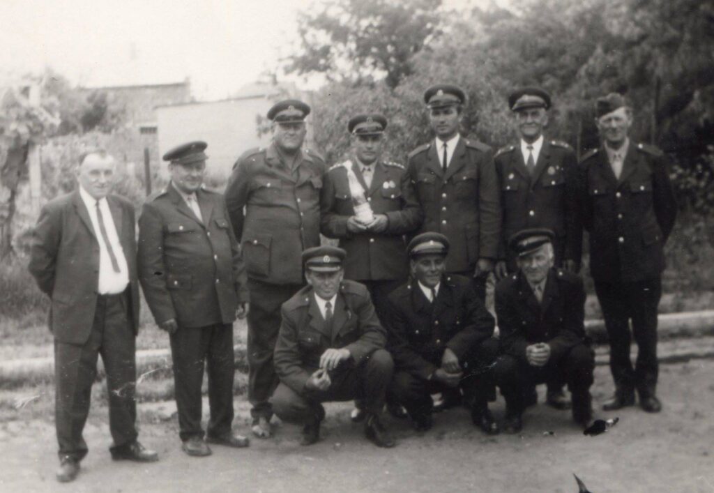 Állnak balról jobbra: Bakó István, Adammkó Ferenc, Szabó János, Kulcsár György (a pezsgővel), Szlízs Ernő, Kamenár János, Jalsovszky Lajos.