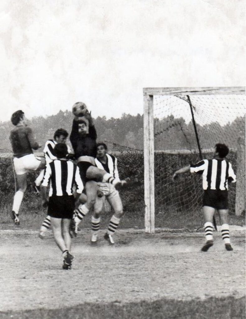 Egy ritka, szép pillanat a régi időből, mikor még a Vág partján volt a focipálya. A fotón, a „fölső kapuban” Farkas Gyula a kapus, és a vágai csapat csíkos mezében Knézel Ernő, Forró Ferenc…
