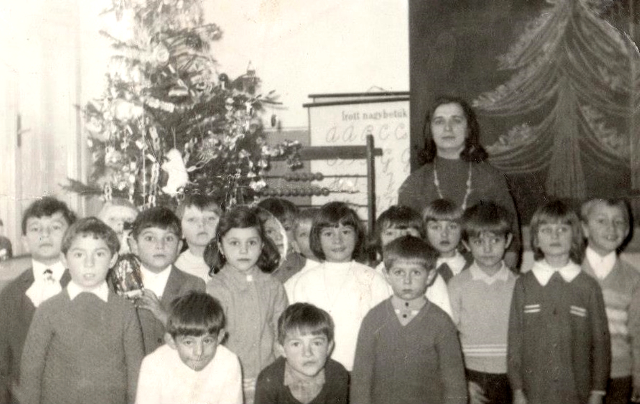 A magyar alapiskola földszinti osztályában, az elsősök B. osztálya látható. Az akkori első A. és B. osztály összesen 34 tanulóból állt.