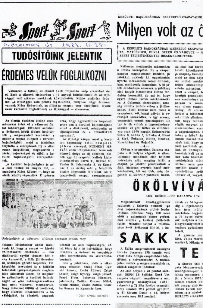 Oláh Gyula mérnök írása a Győzelmes Út című hetilap 1983. november 25-i számában a vágai labdarúgásról, amikor a mátyusföldi község labdarúgó csapatai (a felnőtt, az ifjúsági és a diák csapat is) a kerületi bajnokságban sikeresen helytálltak.