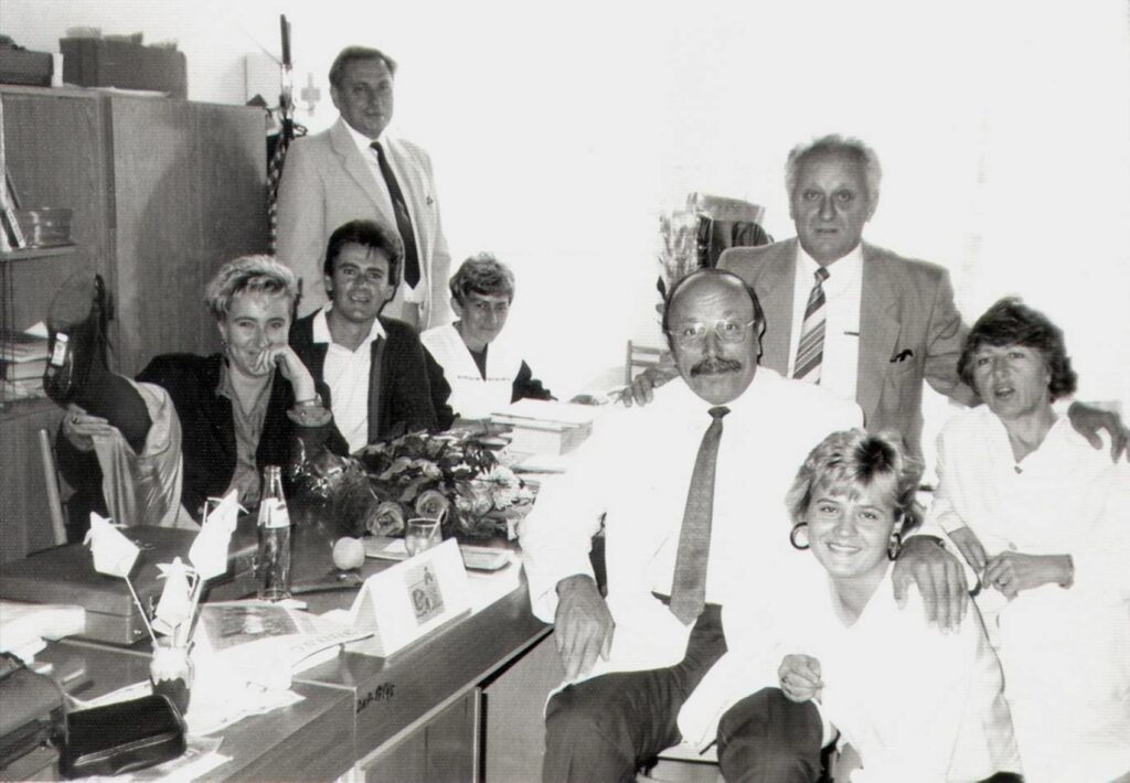 Balról jobbra: Neusch Csilla, Juhász Aladár, Somogyi Antal (iskolaigazgató), Rózsa Margit, Miklós György, Szlízs László, Karácsony Eleonóra (Mészárosné), Blaskovics Piroska.