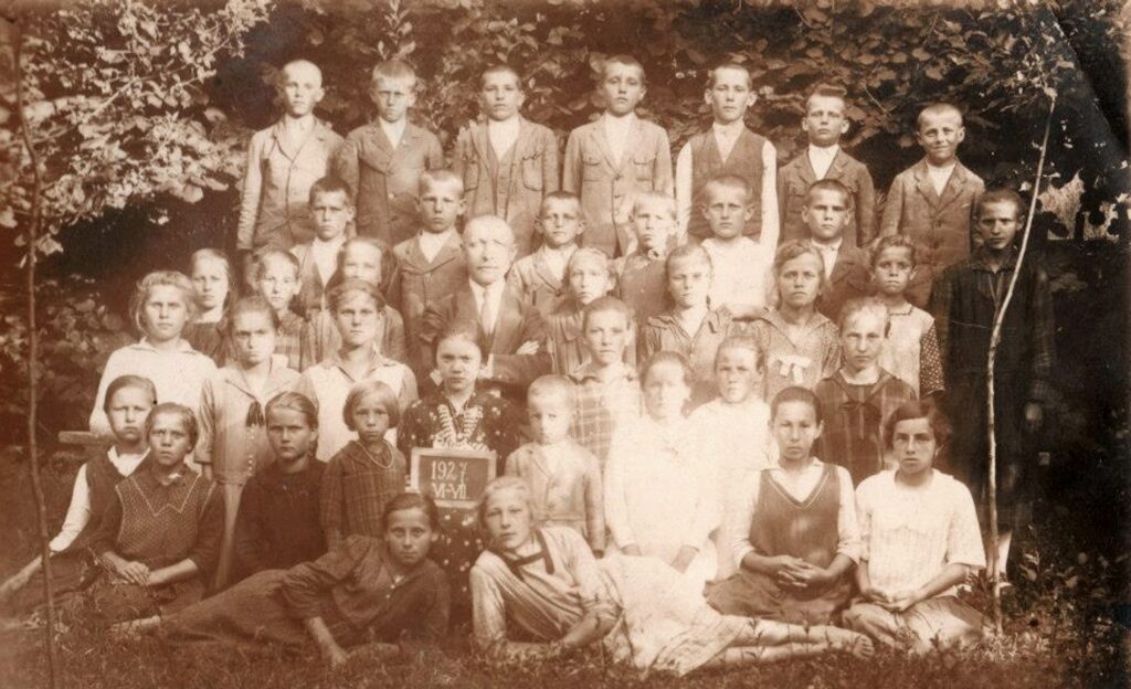 A fotón Kneif József tanító és a tanítványai: Oberman Margit, Takács Erzsébet (táblával a kezében), Farkas István, Takács Margit…