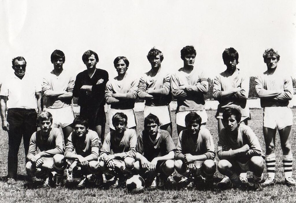 Az ifjúsági focicsapat tagjai állnak, balról jobbra: Farkas László (edző), Simkó Imre, Zsákovics Sándor (kapus), Czakó Sándor, Forró Róbert, Forró Tivadar (csapatkapitány), Puskás Tamás, Sandula Károly.