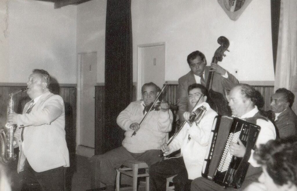 Balról jobbra: Farkas Gyula (szaxofon, Galánta), Patkoló Ernő (hegedű, prímás), Bangó Drahos (hegedű), Biháry (bőgő, Szered), Bangó Vladimír (harmonika), Rácz Mihály.