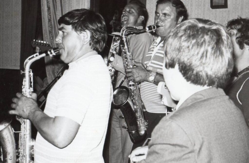 A legendás lagzis zenekar tagjai állnak, balról jobbra: Knézel Ernő (szakszofon), Búčik Jozef (harmonika), Farkas László (szakszofon), Németh János (gitár).