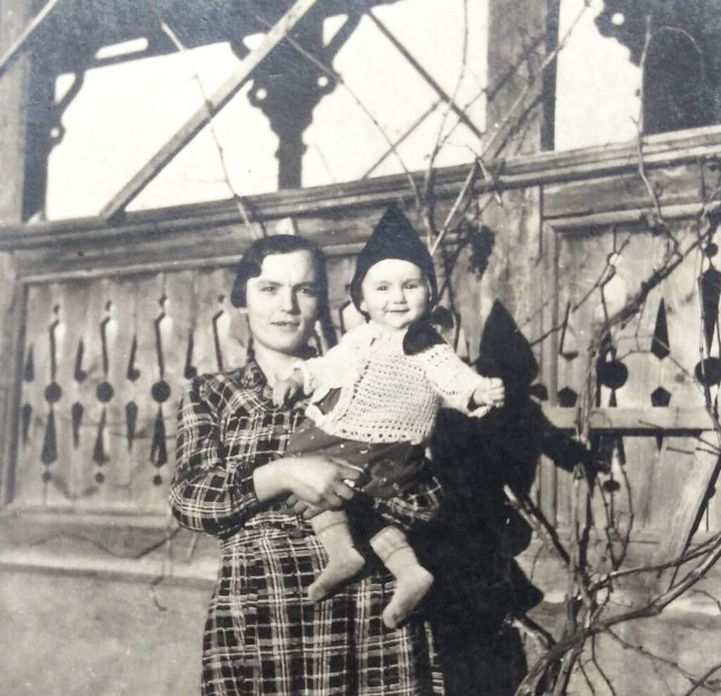 A fotón Nagy Kálmánné sz. Csúr Sarolta és kislánya, a másfél éves Aranka. A fotó hátán a köv. szöveg olvasható: Emlékül küldi az alig ismert drága apukájának a kislánya messze az orosz földre. Aláírás: Aranka 1944