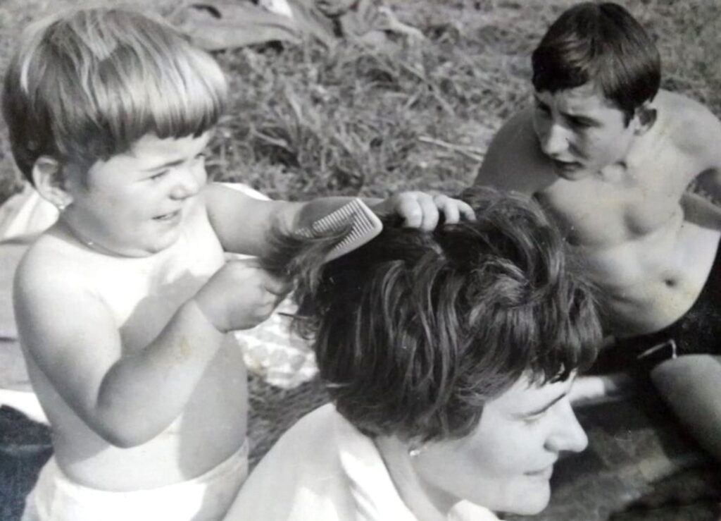 A fotó 1968-ban készült Nagybalogon a Balog patak partján, ahová szivesen jártak a családok fürdeni, pihengetni. A képen a kislány Hacsi sz. Pál Erika látható, ahogy anyukája Pál Dénesné szül. Zagyi Erzsébet haját fésüli nagy odafigyeléssel. Mellettük Kovács László, rokon látható.