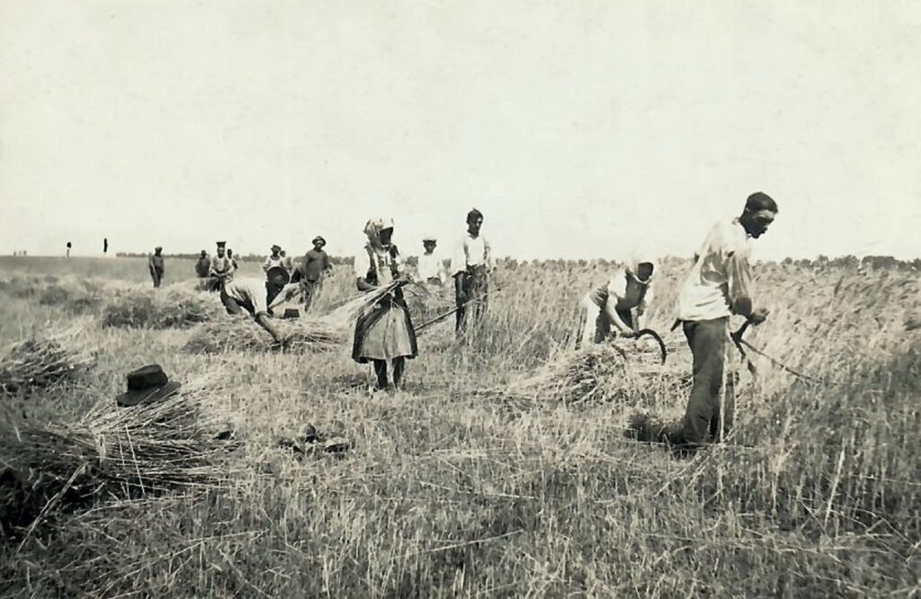 A képen aratók és marokszedők láthatók munka közben, az 1930-as években.
