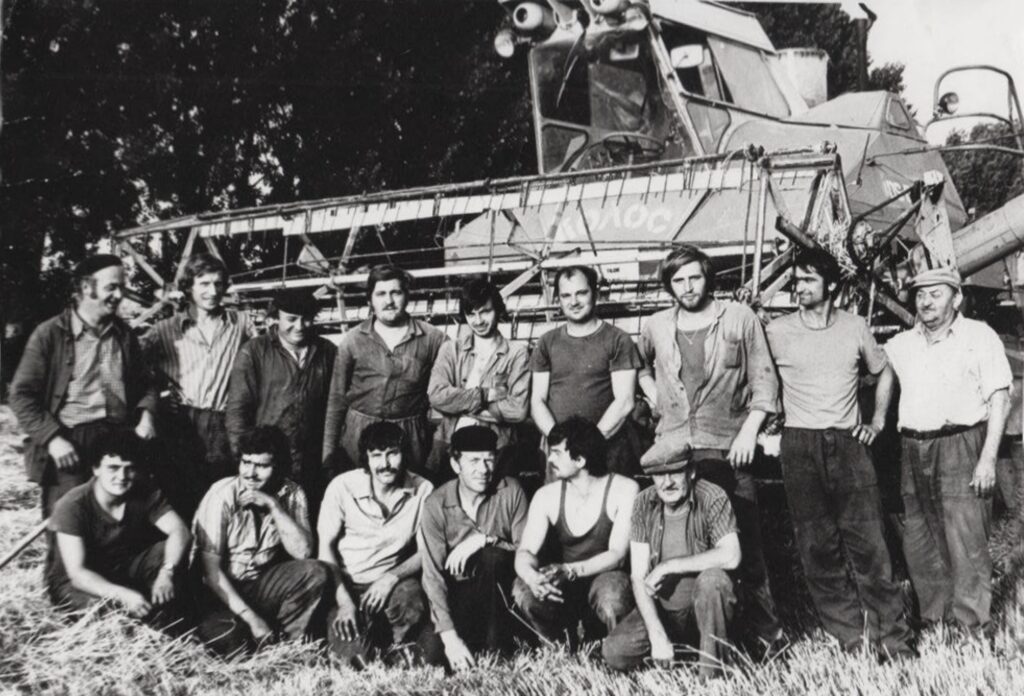 Az aratási brigád a szovjet Kolos kombájn előtt.