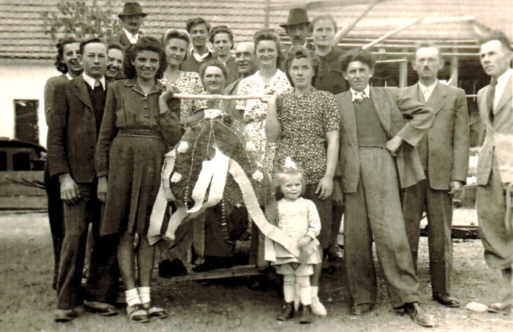 A deportált felsőszeliek és vezekényiek Podbořany-ban az aratási ünnepségre viszik a koszorút. Falunkból a Tánczos család látható a képen.