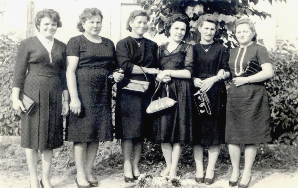 Radnóti menyecskék Czikó Juliska lakodalmában 1960-ban (Ferencz Gizella, Tóth Erzsébet, Varga Jolánka, Palcso Magda, Bodon Gizella, Farkas Jolánka)
