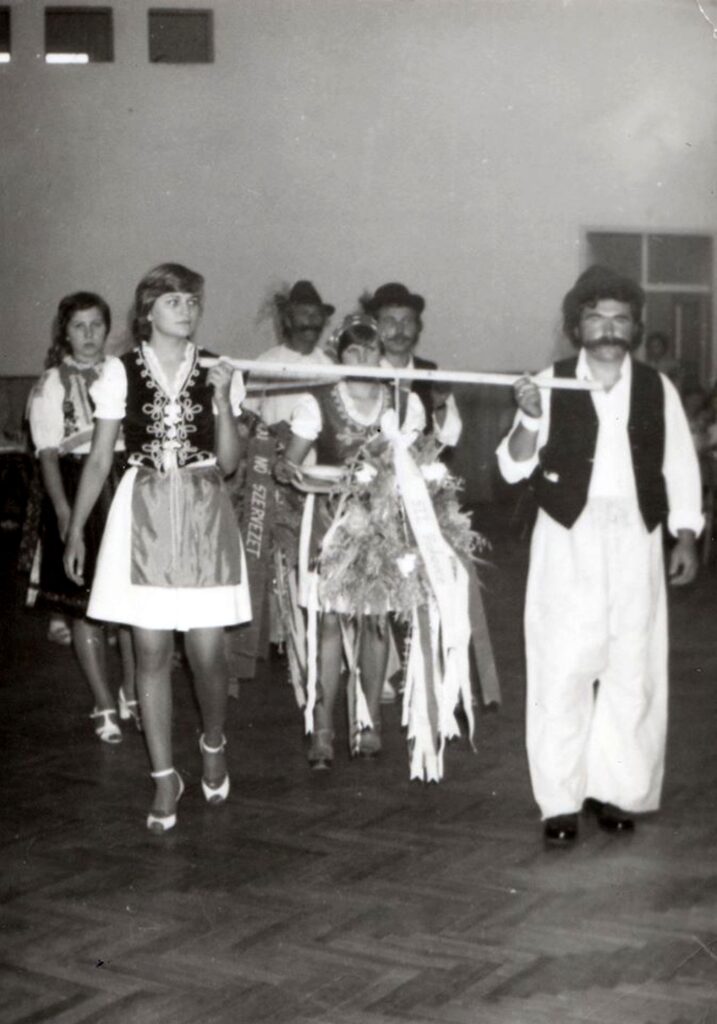A fotó az aratás befejezése utáni ünnepségen készült a kultúrházban, amire már csak az idősebbek emlékezhetnek, pedig valamikor ennek is gazdag hagyománya volt…