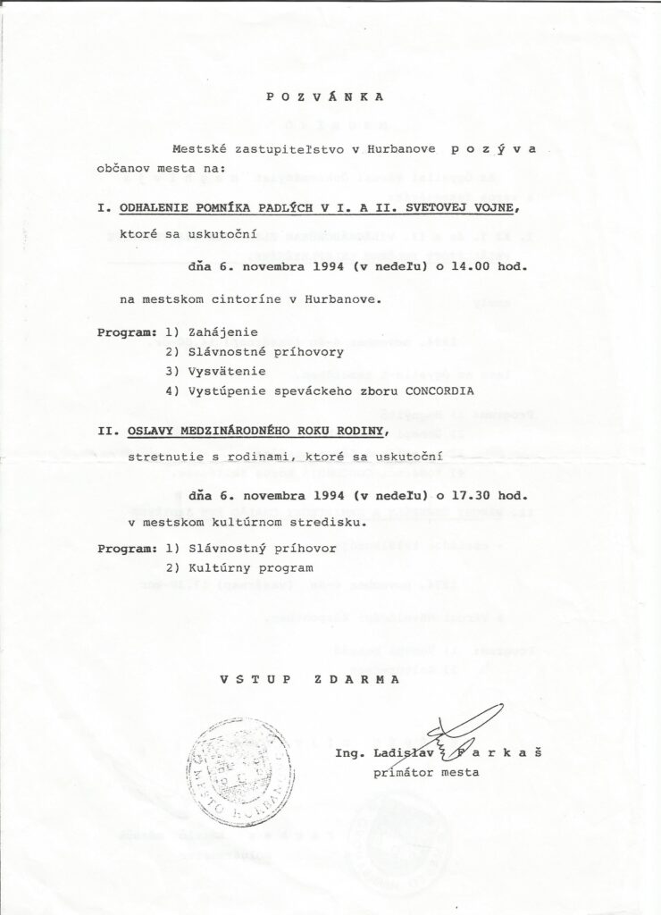 Az önkormányzat szlovák nyelvű meghívója az I. és II. világháborús emlékmű átadásának eseményére.