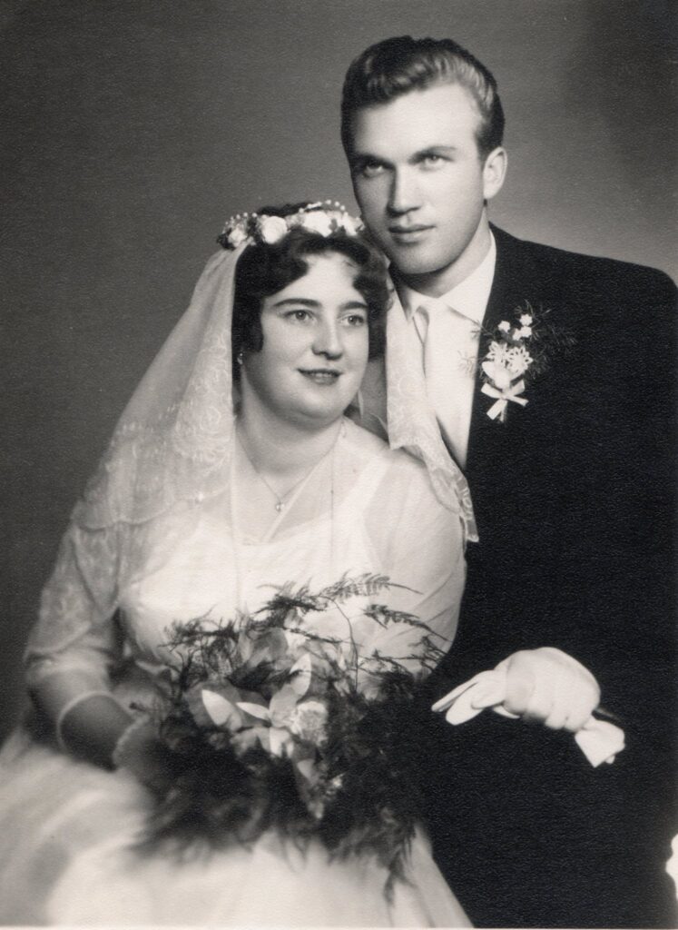 Szlízs Gabriella (született: Takács) és Szlízs Ernő az esküvőjük napján. A lakodalom a menyasszonyi ház (Kertalja) udvarán volt, ahogy a régi időkben volt szokás.