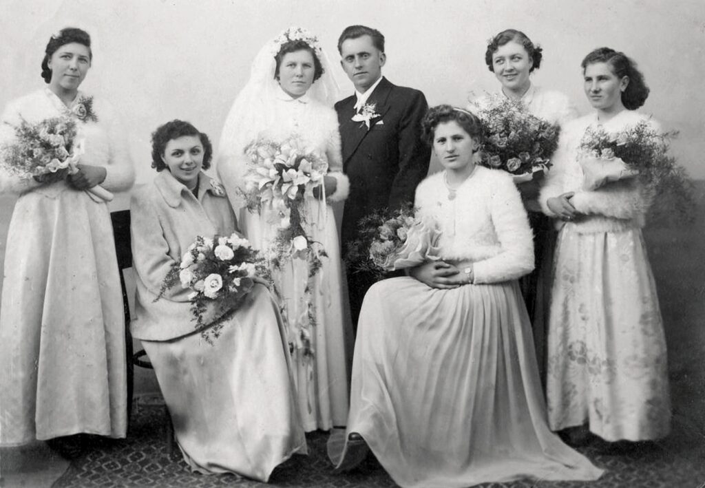 Balról jobbra: Forró Terézia (Zsigóné), Adamkó Arany (Fándlyné), Zsigó Margit (Kozmérné, menyasszony), Kozmér László (vőlegény), Kotrba Irén (Lukácsné), Karácsony Mária (Szabóné), Forró Margit (Farkasné).