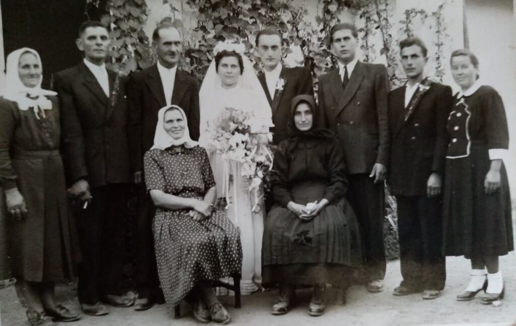 Állnak, balról jobbra: Kotrba Júlia (született: Kamenár), Kotrba István, Forró Antal, Csomor Adél (menyasszony, született: Forró), Csomor Lajos (nagyölvedi vőlegény), id. Forró Albert, Csomor András, Csomor Andrásné.