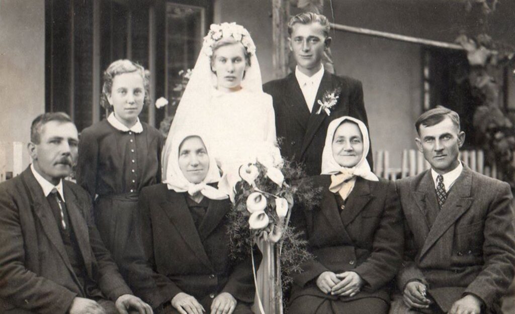 Állnak balról jobbra: Jalsovszky Veronika (Fördősné), Török Mária Zsuzsanna (menyasszony, született Jalsovszky), Török János (vőlegény).
