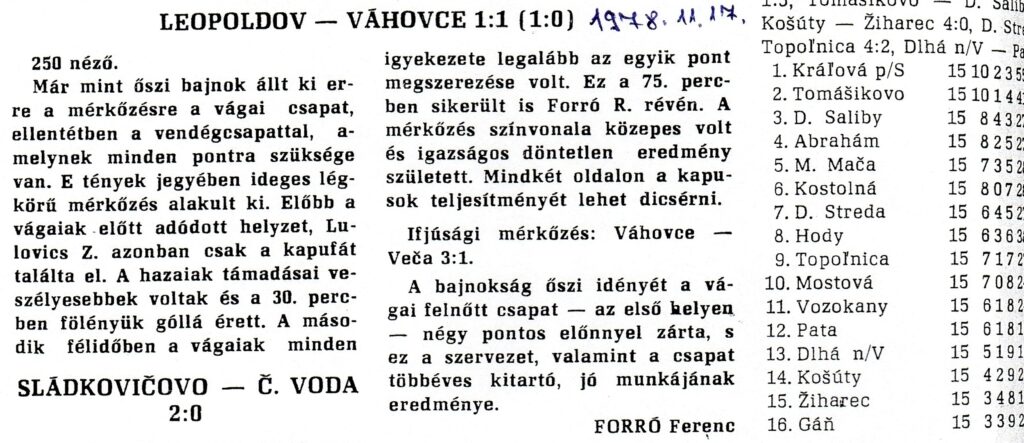A bajnokság őszi idényét a vágai felnőtt labdarúgó csapat – az első helyen – négy pontos előnnyel zárta.