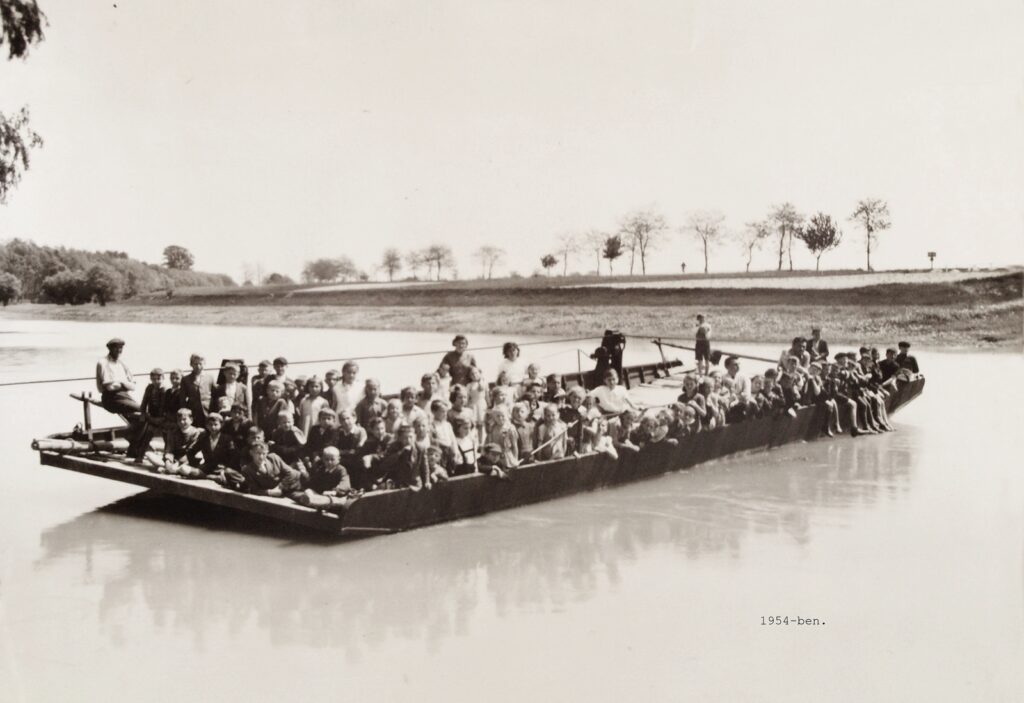 A képen látható iskolás csoport 1954-ben kelt át komppal a Kis-Dunán.