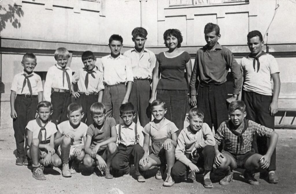 Úttörőtáborban, amelyen sok környékbeli diák vett részt. A guggolók közül, balról a harmadik Zsigó Zoltán, és mellette a negyedik, Takács Sándor, vágaiak.