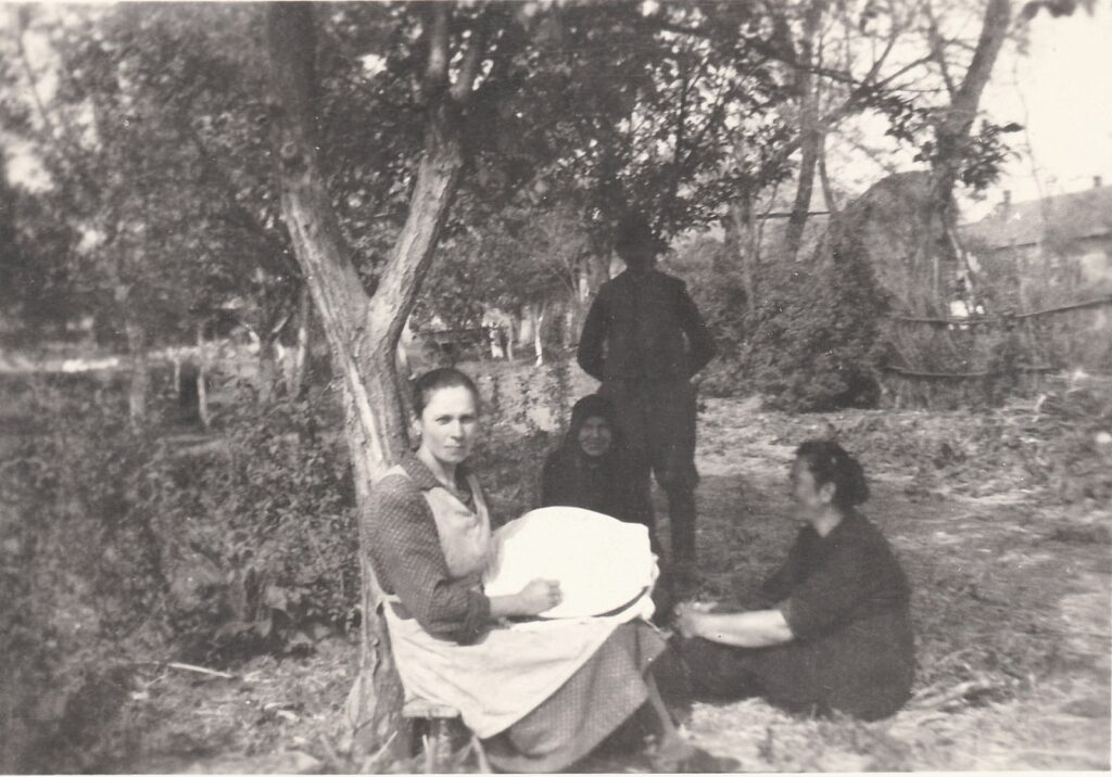 Csintalanné Czunyi Margit a házukhoz tartozó portájukon a fa tövében azsúroz. Mellette anyósa. apósa és barátnője.