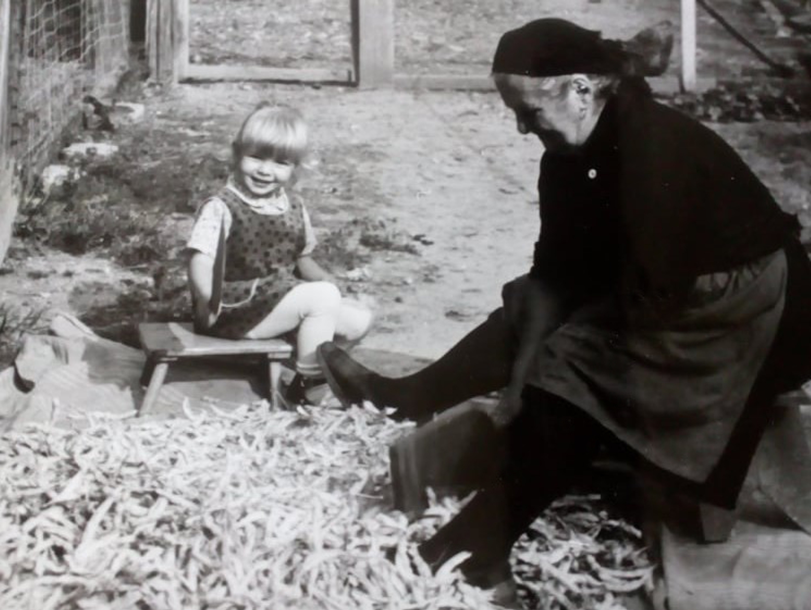 A fotó 1984-ből való: Poznán Jánosné unokájával Seres Évikével babot sulykol az udvaron.