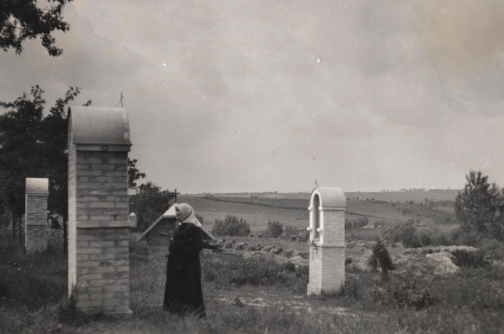 A Cigléd kegyhely egyik létesítménye a Mária-kápolnától a Szentháromság nagykápolnáig tartó kálvária. Az 1939-ben épült kálvária elején van a Fájdalmas Szűz hét stációja, majd Krisztus keresztútjának 14 stációja. A fotón a nagykápolna felől volt fotózva (a háttérben látszik is a Mária-kápolna), mely Galgóczi Anna fotóalbumából került elő.