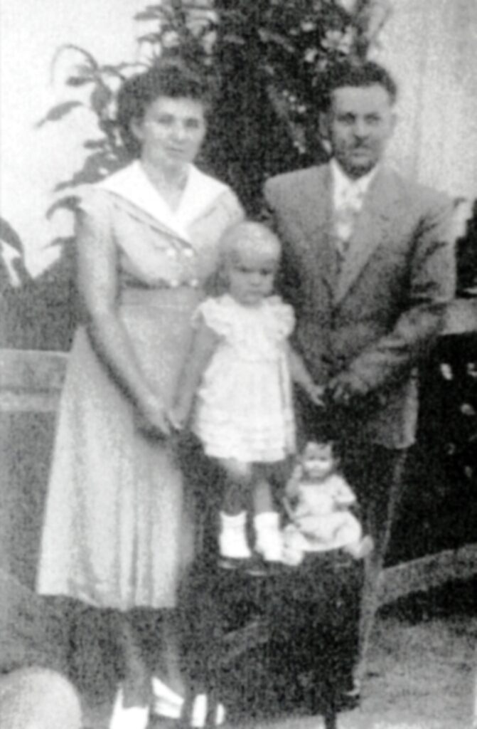 Családi fotó Nagybalog, Gyetva, 1957. A kislány Takács sz. Asztalos Viola haját kopaszra nyírták, hogy sűrűbb legyen.
