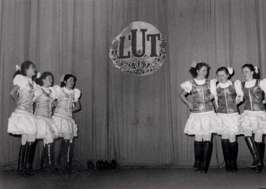 A helyi Csemadok néptáncosai a ĽUT (Ľudová umelecká tvorivosť) által szervezett fesztiválon, valamikor az 1950-es években. A tánccsoport tagjai: Csókás Erzsébet, Hanula Elza, Kovács Mária, Worák Fáni, Gléba Márta