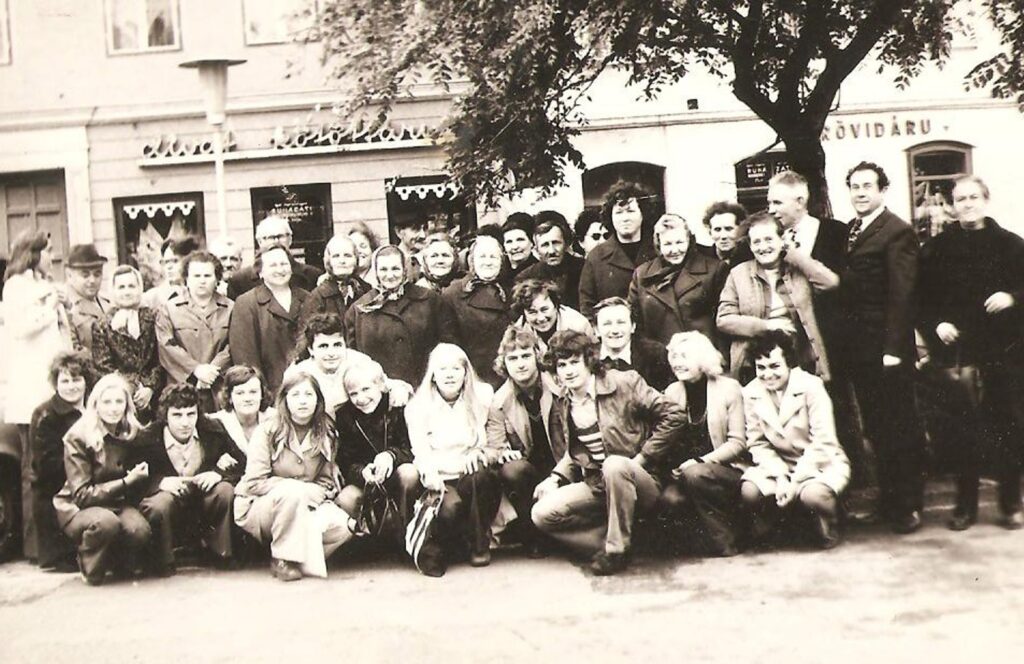 Az első magyarországi kirándulásokat az 1970-es évek közepétől szervezte a Csemadok, általában esti színházlátogatással egybekötve. A felvételen a falu apraja-nagyja látható.