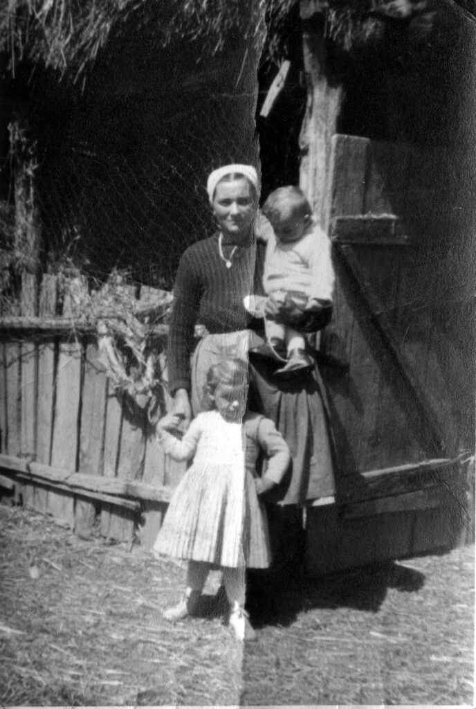 Anya két gyermekével. Viselete elpolgáriasodottabb. Felettük a háttérben kicés (szalmazsuppos) födém pereme.