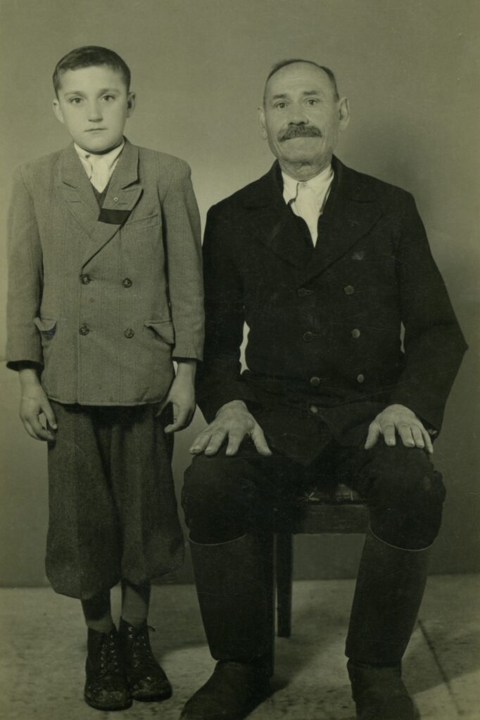 Férfi és gyermek polgáriasabb ruhában.