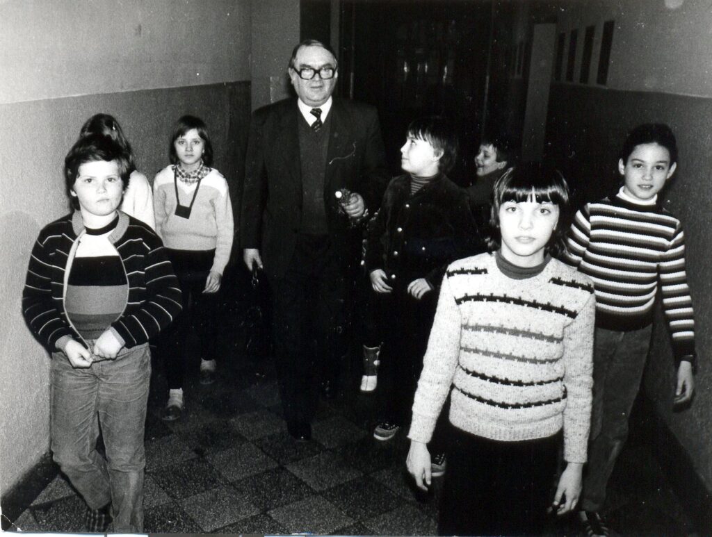Dénes György gyermekek társaságában a pozsonyi Duna utcai Alapiskolában