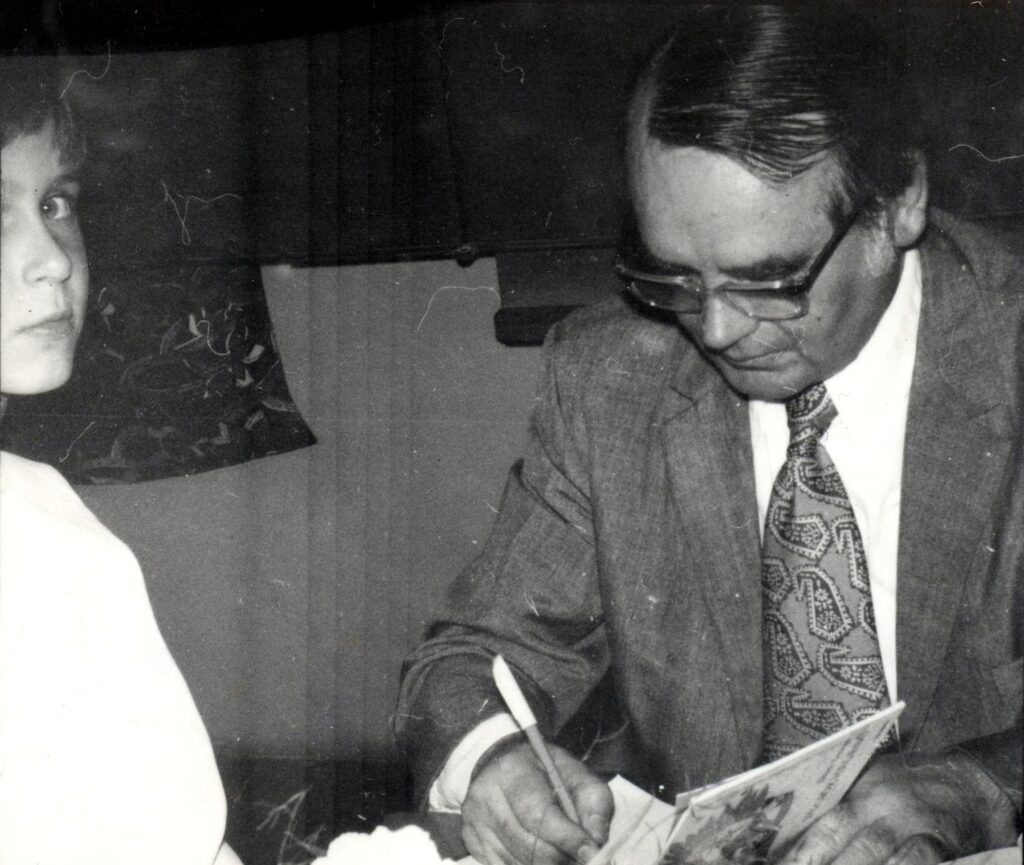 Dénes György Tücsökhegedű (1974) című gyermekverskötetét dedikálja.