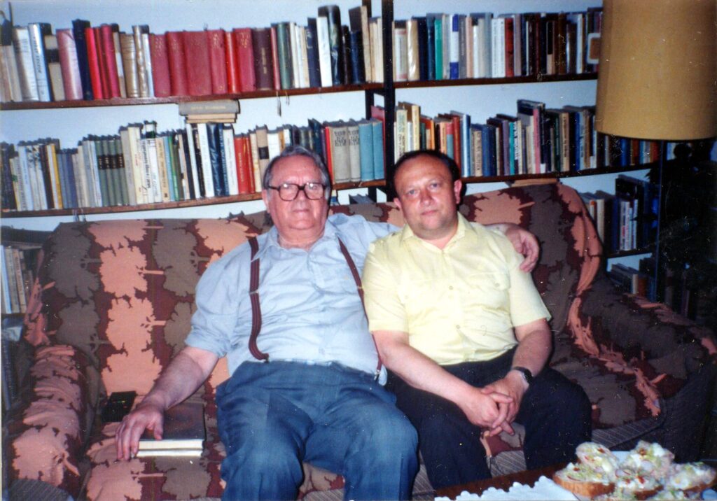 Dénes György Martinček utcai otthonában Oros László felsőszeli könyvgyűjtővel az 1990-es évek végén.