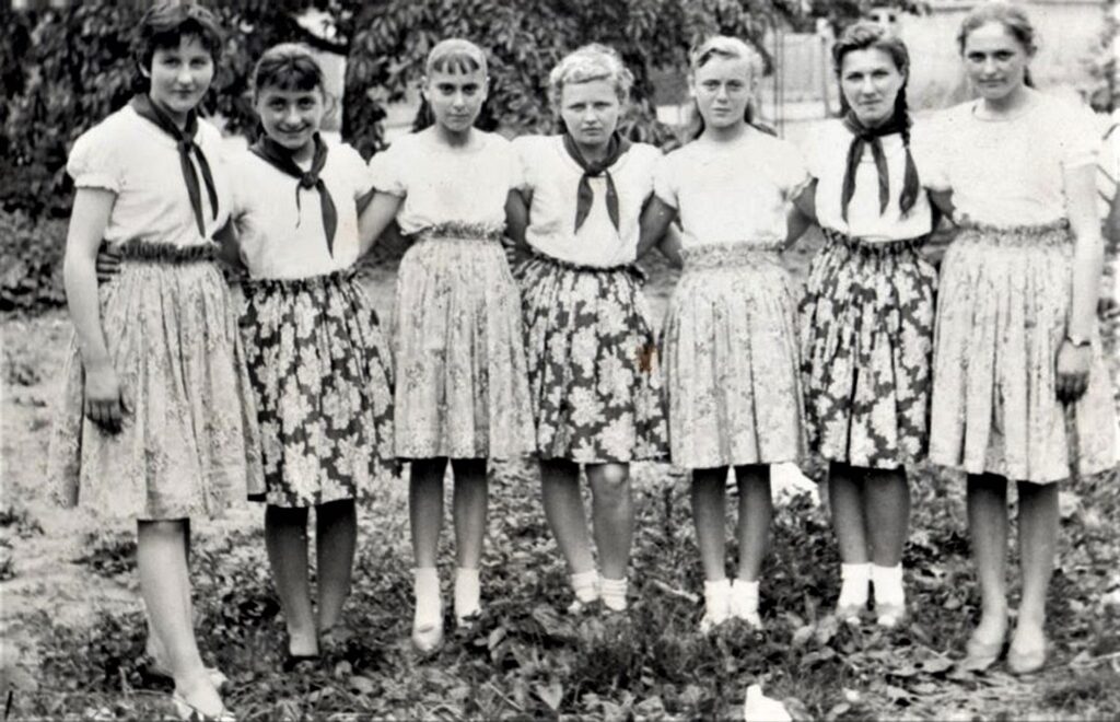Balról jobbra: Szabó Irén, Kamenár Katalin, Majerník Mária (Kamenárné), Majerník Margit, Dudás Erzsébet, Éliás Erzsébet (Józsáné), Oberman Edit (Gyeváthné).
