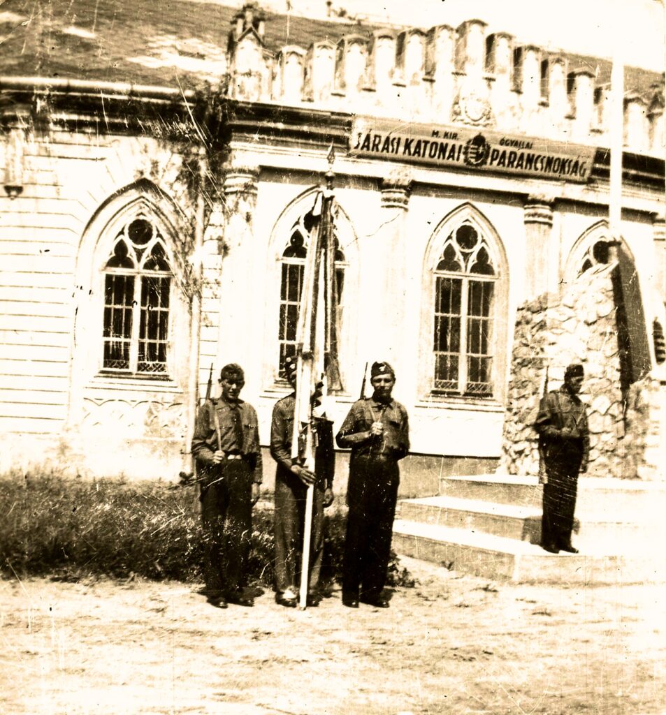 „Országzászló előtt elvonuló leventék, leventelányok, frontharcosok, ünneplő közönség csoportja hajtott fejet a Trikolór előtt, no persze az akkori falu – járás – nagyságai előtt. A Leventék ifjú és bizakodóan viruló csoportjának díszlépései, a jobb – szebb jövőbe való hitével verte díszlépésben az ütemet. A frontharcosok szövetségének komor arca(l), visszagondolva – felidézve Doberdót, Piavét, Przemyslt stb. ahol mennyi de hány bajtársuk maradt az idegen földben porladva s otthon hagyva szülőt, feleséget, gyermeket – verve a díszlépést, melynek üteme szinte figyelmeztetőként csattogott – tiltakozásul a háborúk ellen. Vi-gyáz-za-tok-ne-hogy-ti-is-így-járjá(a?)tok!” (19. o.)