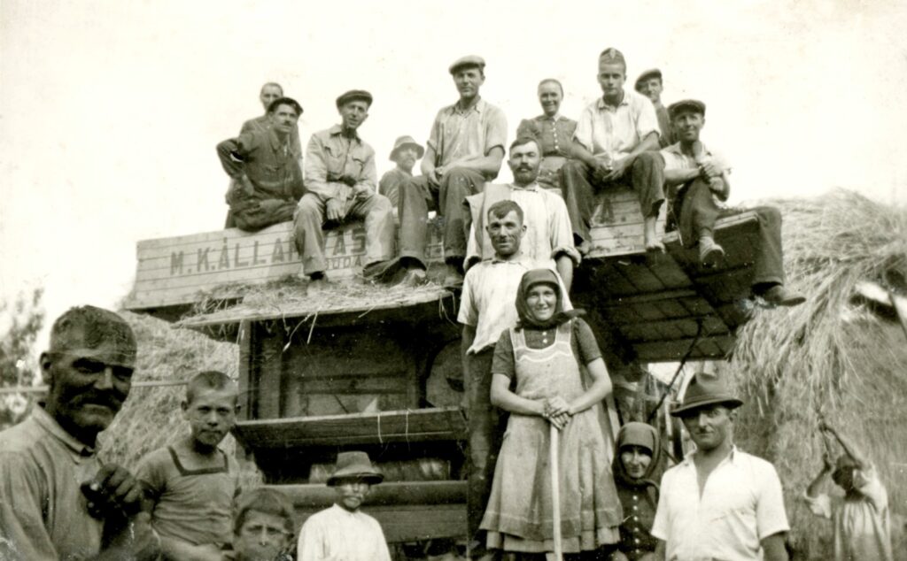 A képen hetényiek a Magyar Királyi Államvasutak tulajdonában lévő cséplőgépen.