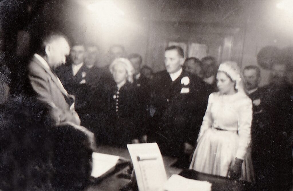 A fényképen Csintalan Benő és Czunyi Margit esküvője 1936. október 20-án, mellettük egy másik fiatal pár a községházán.