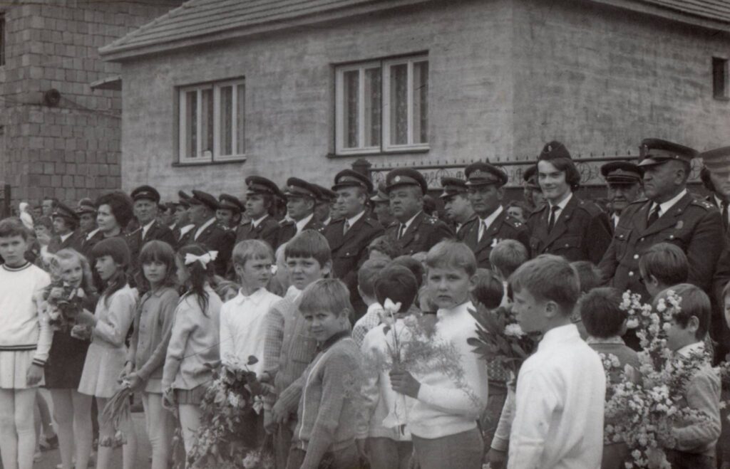 A fénykép egy tragikusan elhunyt kisfiú (Polakovics Péter) temetésének a napján készült. Háttérben az Önkéntes Tűzoltó Testület tagjai, elöl a Vágai Kilencéves Alapiskola diákjai. Abban az időben az elhunytat még otthon ravatalozták fel.