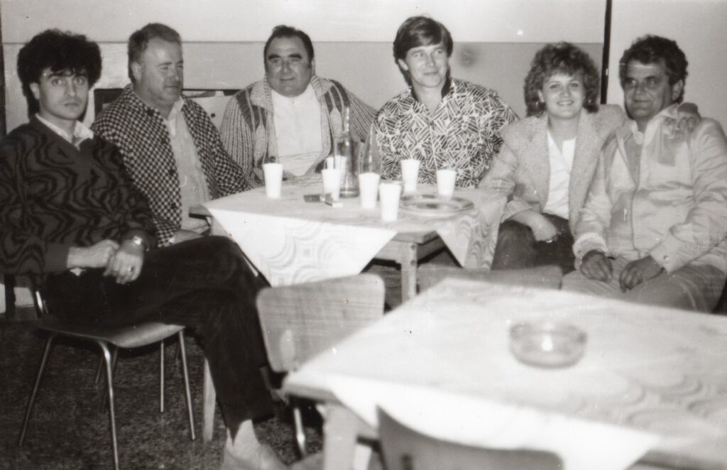 A kultúrház előcsarnokában ülnek, balról jobbra: Lancz Imre, id. Karácsony István, Bugyinszky László, ifj. Mészáros Dezső, Karácsony Eleonóra (Mészárosné), Karácsony János.